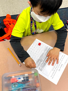 In the morning we had a little more time since we didn't have gym and music so we did a math game called Race to 100. The class LOVED playing it! For this game, I gave them the game and a die. The point of the game was to see how many times they needed to roll their die to get to 100 at the end. As they rolled they kept track by making tally marks at the top of their page as they colored. They had so much fun playing this game today. As they were playing, they were looking around the room with excitement to share the amount they rolled on their dice. It was cute! Here are some pictures of my morning friends playing the game:
