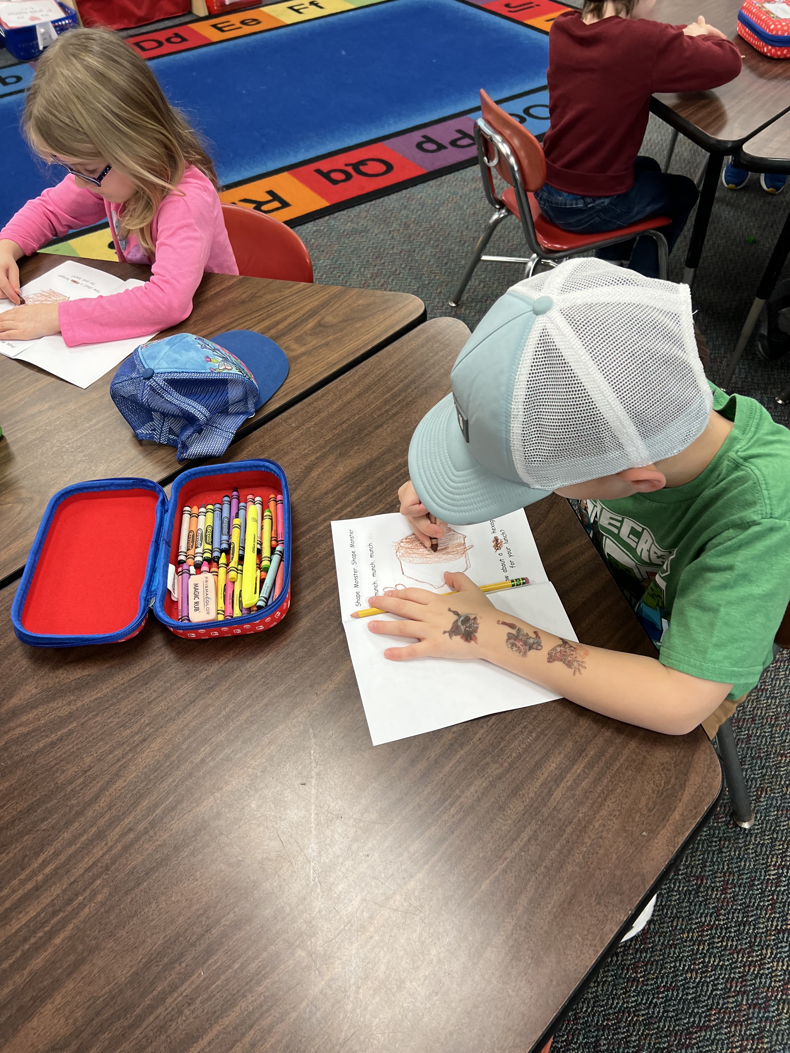 In kindergarten today, we have continued working on learning all about 2D and 3D shapes. To help them in solidifying the names of the shapes and learning about them, we did the "Shape Hokey Pokey" and a mini-book called Shape Monster, Shape Monster, Munch, Munch, Munch! They had so much fun doing the hokey pokey with the wooden shapes and showing me what shape experts they all were when we did the mini-book together. I am so proud of how well they are learning the shapes and can describe how they are different from one another! Way to go, K-1 and K-3! We are having so much fun in kindergarten!